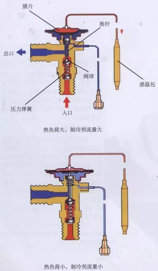 工作時,固定在蒸發器出口管道上的感溫包感應蒸發器出口的過熱溫度,使感溫包內產生壓力,并由毛細管傳到膜片上部的空間,在壓力的作用下膜片以彈性變形的方式把信號傳遞給頂針(執行機構),從而調節閥們的開度,控制制冷劑的流量。