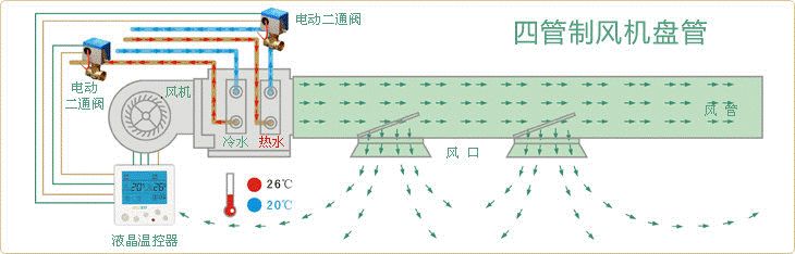 四管制空調指空調箱同時裝有冷盤管和熱盤管,每組盤管一進一回,共四根,所以叫四管制。兩組水管分別接入冷水和熱水,也就是一年四季不管什么時候,制冷制熱都可以隨時切換,可以實現(xiàn)一些房間供熱的同時,另一些房間供冷。并且配合末端設備能夠實現(xiàn)室內溫度和濕度精確控制的要求;由于冷水和熱水在管路和末端設備中完全分離,有助于系統(tǒng)的穩(wěn)定運行和減小設備的腐蝕;所以它的標準高,成本也高。所以全年運行過程中,供冷和供熱工況頻繁交替轉換或需同時使用的空氣調節(jié)系統(tǒng),宜采用四管制水系統(tǒng)。它較適合于內區(qū)較大,或建筑空調使用標準較高且投資允許的建筑中。