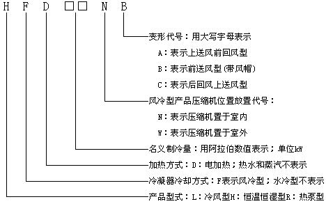 型號舉例:HF19N 表示名義制冷量為19kW的壓縮機置于室內(nèi)的風冷型單元式空調(diào)機組。